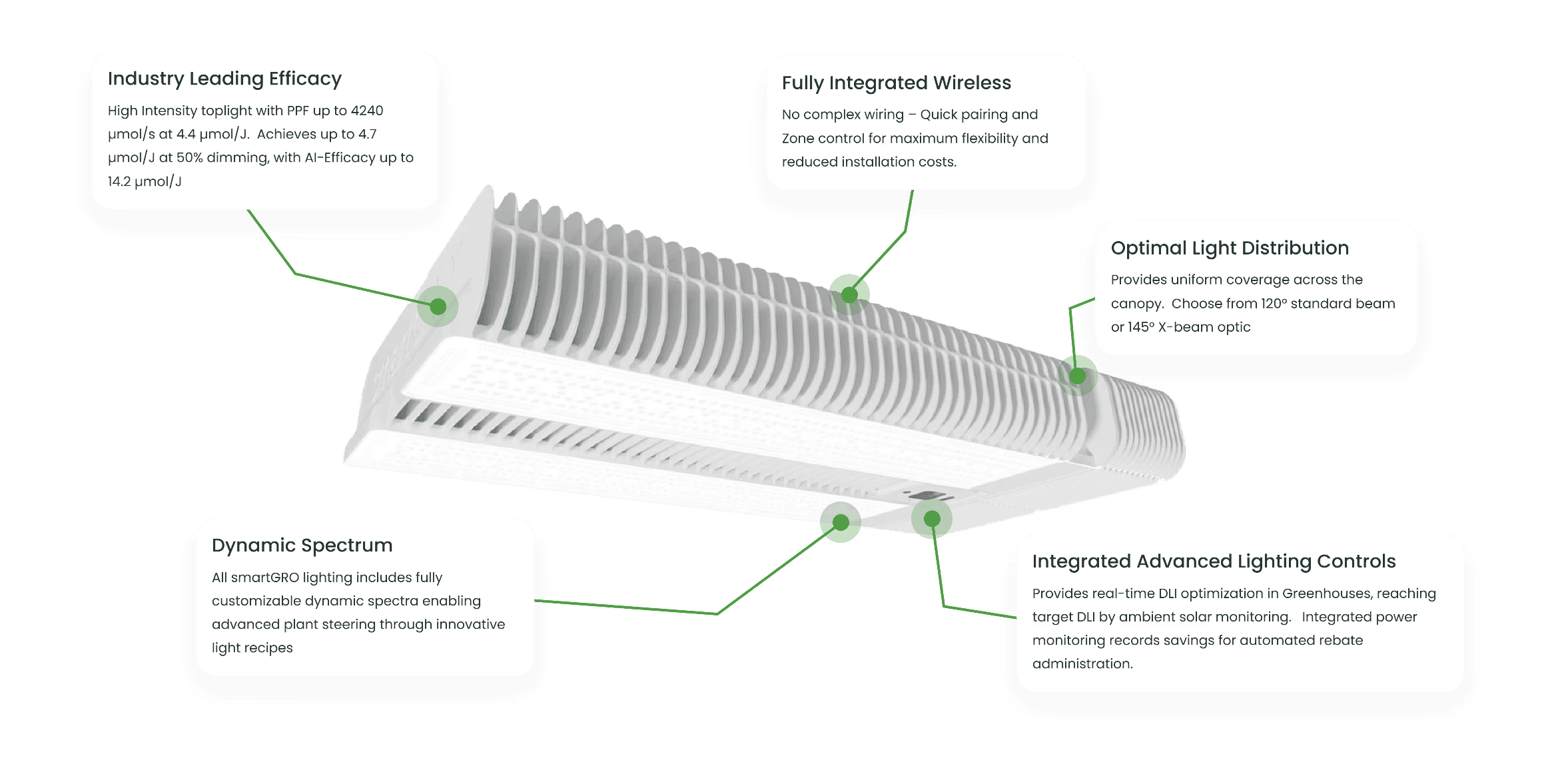 A new benchmark in horticultural lighting with maximum efficacy up to 4.7 μmol/J (DLC validation pending) SmartGRO APEX is engineered to deliver unmatched crop performance with industry-leading energy savings. Our patent-pending PRISM™ technology leverages our AI-powered light engine and cutting-edge crop science to push efficiency, yield and quality beyond the limits of traditional LED lighting - positioning growers for the highest ROI in the industry.